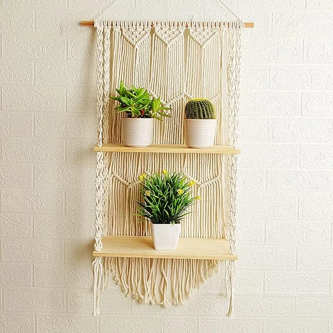 Chaokui 3 Tier Macrame Wall Hanging Shelf, Handmade Bohemian Macrame Shelf for Plants and Decor…