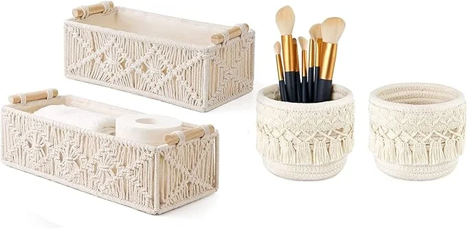Mkono 4 Pcs Macrame Storage Baskets, Bohemian Decor Box for Makeup Brushes, Organizer…